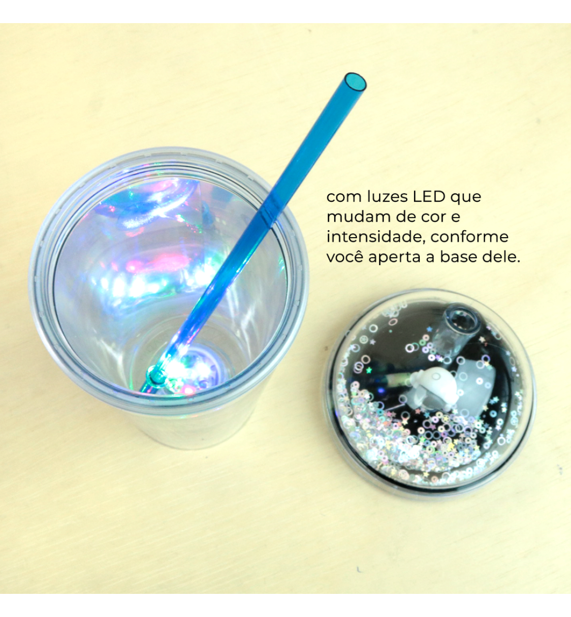 Este copo com LED, plástico e canudo de 450ml com personagem de astronauta, irá deixar o suco ou shake da criançada muito mais divertida. Este copo combina funcionalidade e estilo e capacidade generosa de 450ml. O design é aprimorado com um sistema de Led incorporado, que adiciona um toque de brilho e diversão. Os LEDs podem apresentear diferentes cores ou padrões, proporcionando uma atmosfera vibrante, especialmente em ambientes com pouca luz.